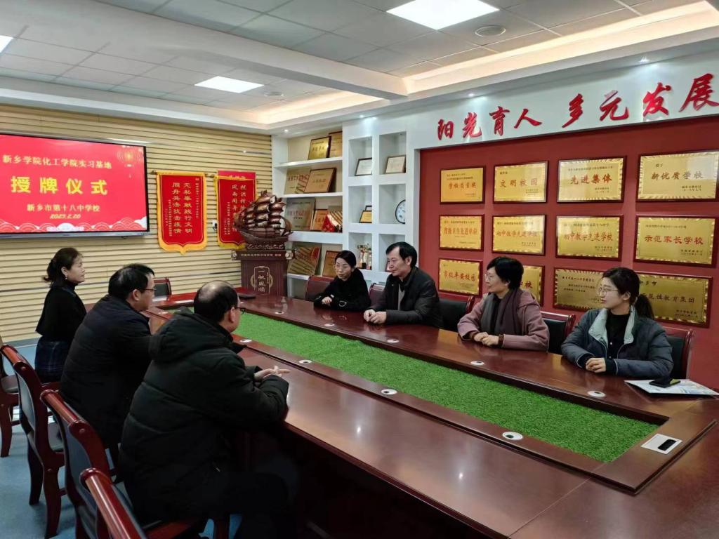 首先,新乡市第十八中学校长林长峰介绍了学校的发展历程、教育理念、校园文化和办学特色。接着,周建伟院长介绍了我院化学师范专业的人才培养、专业建设、科学研究、校际交流等情况。双方表示要以共建教学实习基地为契机,充分发挥各自优势,积极探索协同育人、深度合作的新途径和新方法,开展全方位、多层次的深度合作,共同培养出更多高水平、高素质的中学优秀教师。